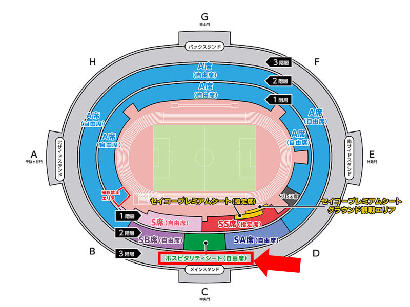 ※ホスピタリティシートの購入で2階層メインスタンド中央の観客席に加え、A席での観戦も可能です。